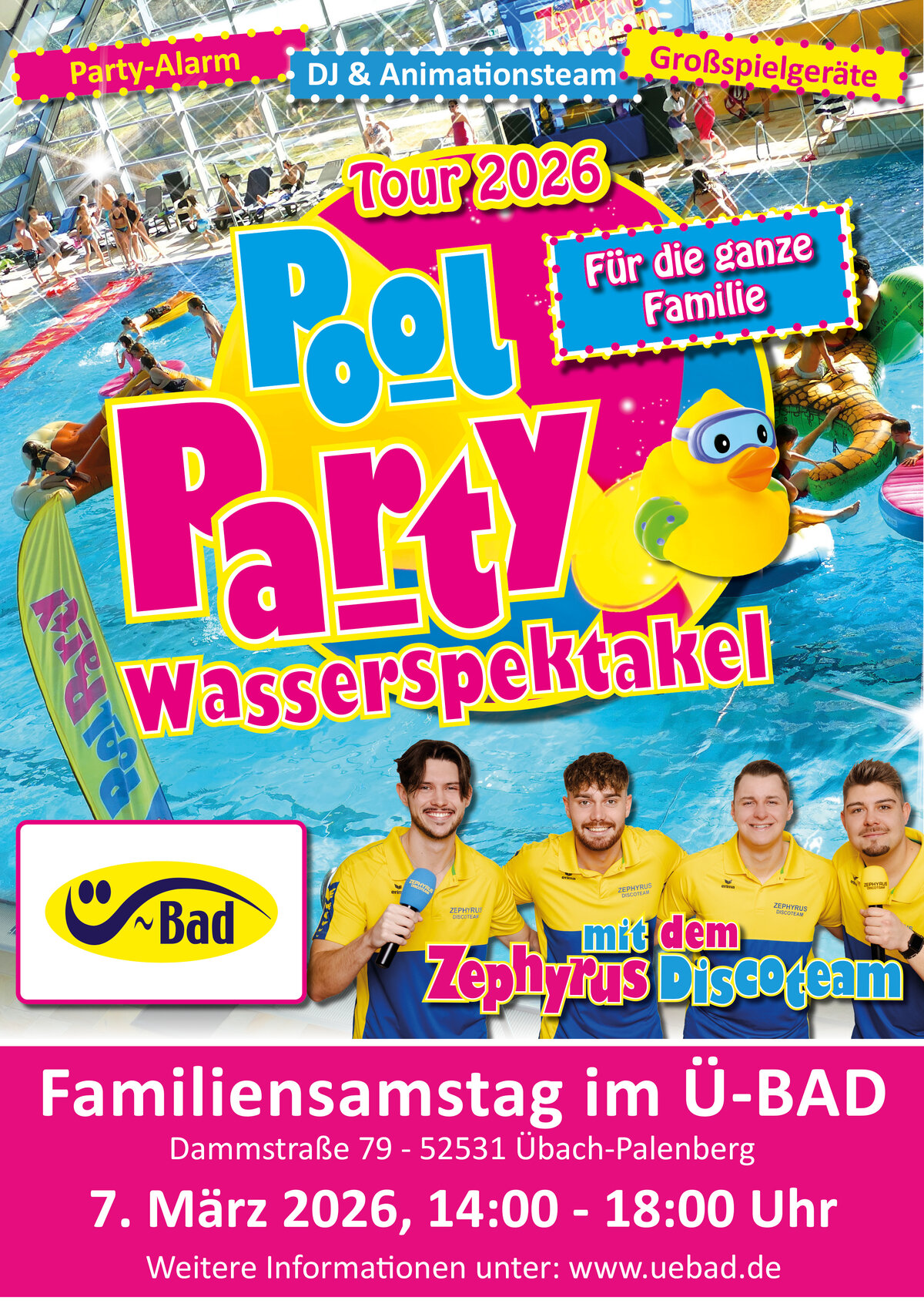 Das bundesweit bekannte Pool-Party-Team vom Zephyrus-Discoteam macht im Rahmen seiner Frühjahrstour Station in Übach-Palenberg. Das Team aus Leopoldshöhe bei Bielefeld ist seit vielen Jahren auf familiengerechte Eventformate in Hallen- und Freizeitbädern spezialisiert und tourt in diesem Frühjahr durch mehr als 50 Bäder in ganz Deutschland.